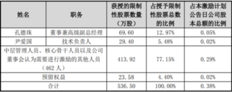 草案显示,本次激励计划采用限制性股票作为激励工具,激励对象为在公司(含分公司及控股子公司)任职的董事、高级管理人员、中层管理人员、核心骨干以及公司董事会认为需要进行激励的其他人员(不包括公司独立董事、监事及单独或合计持有公司5%以上股份的股东或实际控制人及其配偶、父母、子女)。拟授予的限制性股票数量为536.5万股,约占本计划公告时公司股本总额0.38%。其中,首次授予512.92万股,约占当前公司股本总额的0.36%;预留授予23.58万股,占本次授予限制性股票总数的4.40%,约占公司当前股本总额的0.02%。本激励计划有效期为自限制性股票授予登记完成之日起至激励对象获授的限制性股票全部解除限售或回购注销之日止,最长不超过48个月。