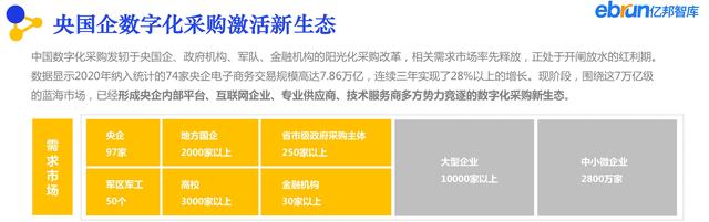 作为企业数字化改造的重要组成部分,采购数字化往往成为第一个突破口,而央国企、政府机构、军队、金融机构的阳光化采购改革,让相关需求市场率先释放。以央企为例,据央企电商联盟数据统计,2020年纳入统计的74家央企电子商务交易规模高达7.86万亿,连续三年实现了28%以上的增长。