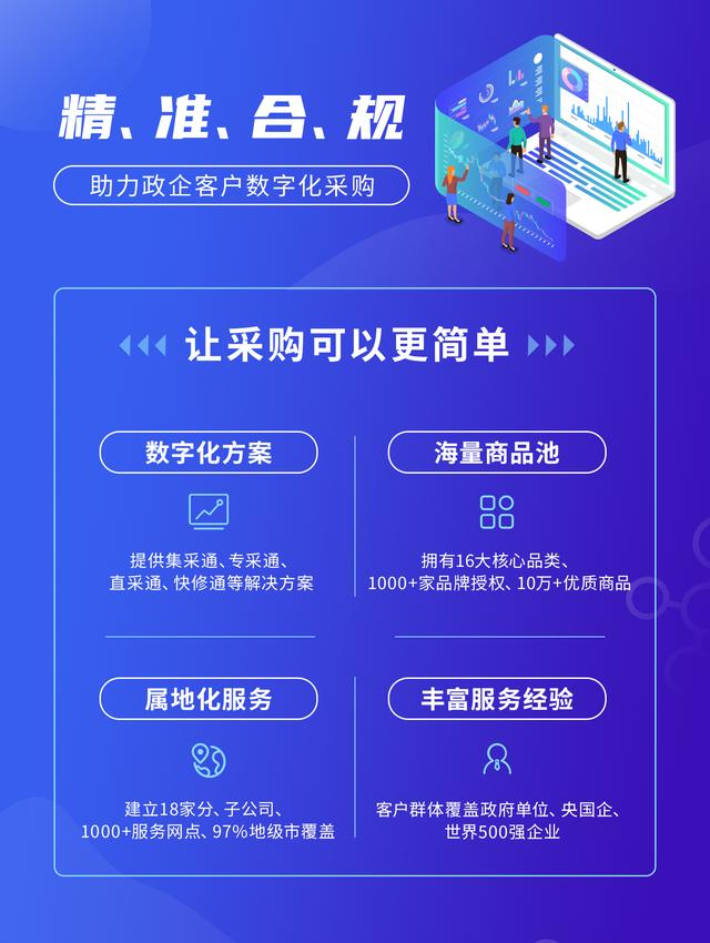 产品数字化:集成十万级优质产品,满足一站式采购需求;搭建中台商品大数据中心,通过对商品数据的规格参数智能化转化,提供更精准的商品比价服务。
