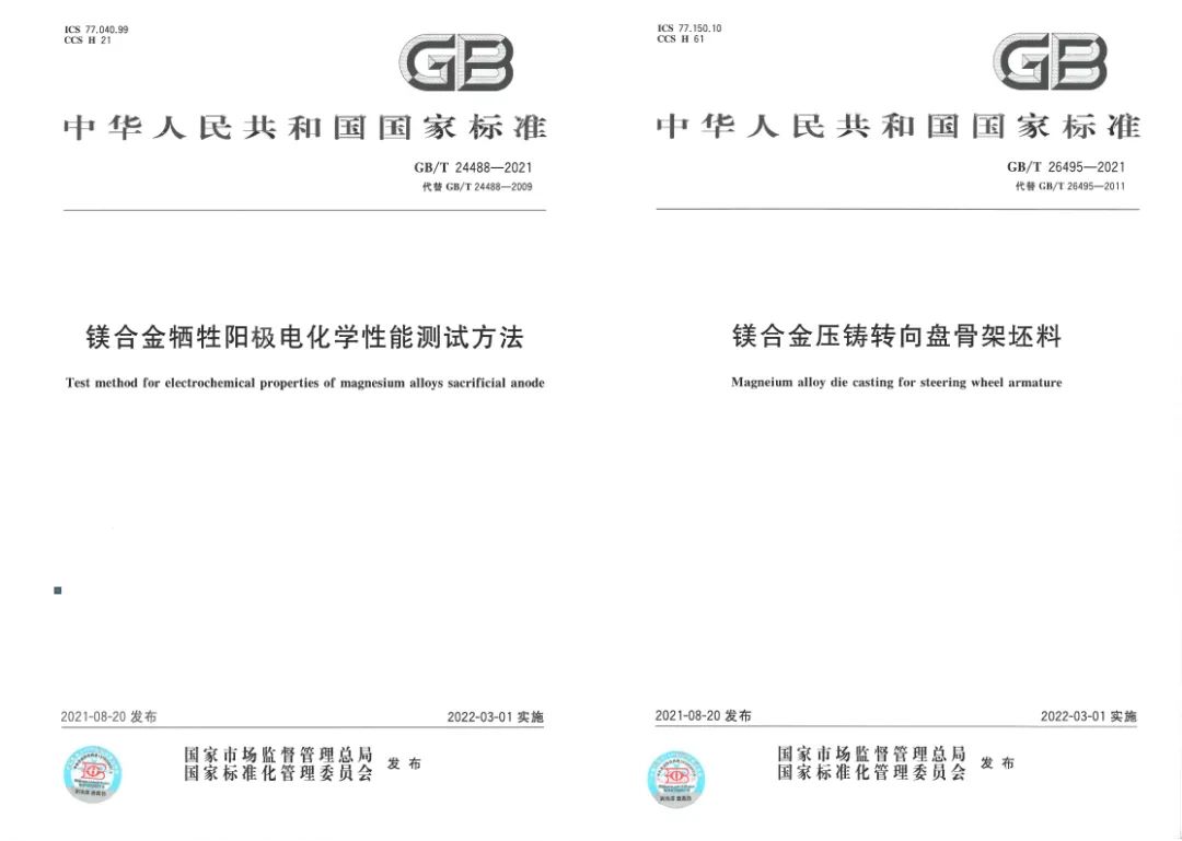 日前,由国家市场监督管理总局、国家标准化管理委员会发布的《镁合金牺牲阳极电化学性能测试方法》《镁合金压铸转向盘骨架坯料》2项国家标准正式刊印,并于2022年3月1日正式实施。