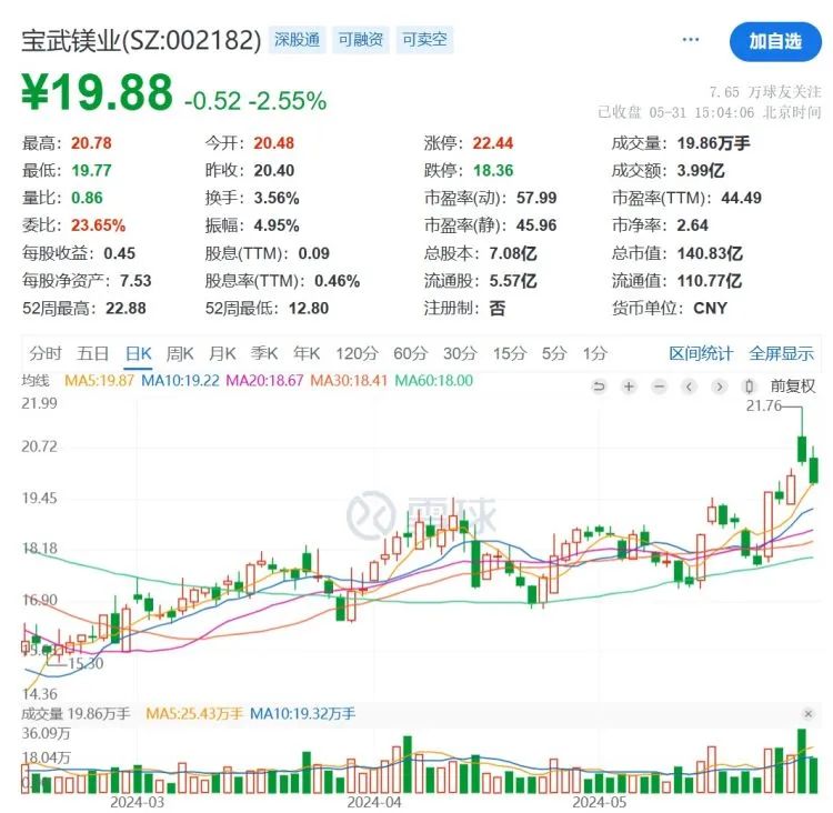 二级市场上,截至31日收盘,宝武镁业报19.88元/股,下跌2.55%,总市值140.83亿元。