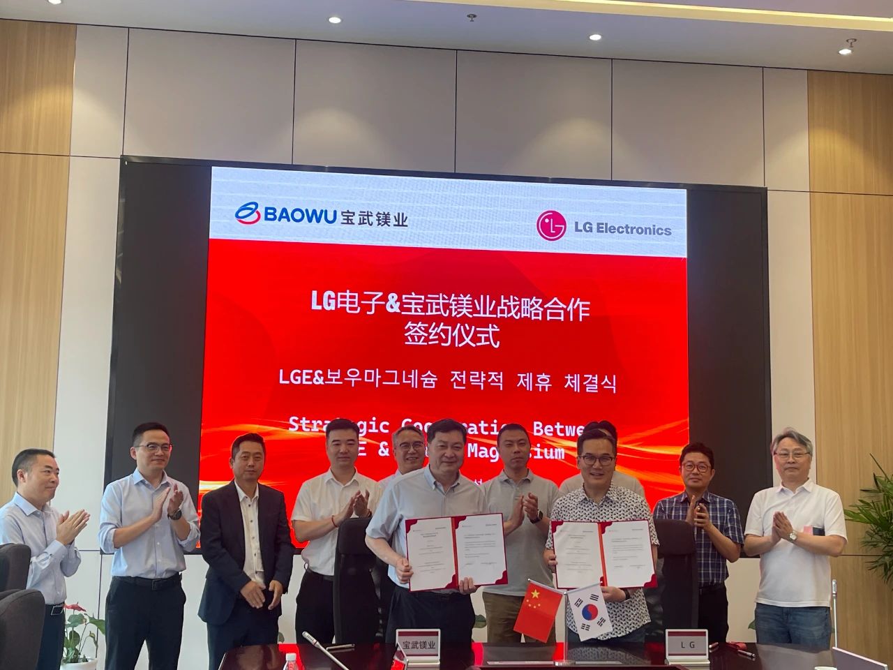 随后,宝武镁业与LG电子举行战略合作签约仪式,由宝武镁业董事长梅小明与LGE常务崔成洙共同签署《镁合金战略意向书》。