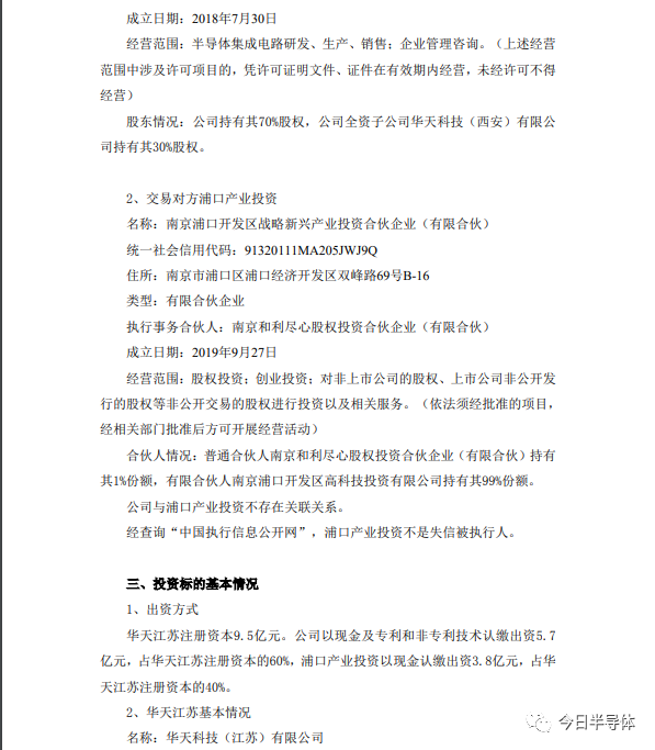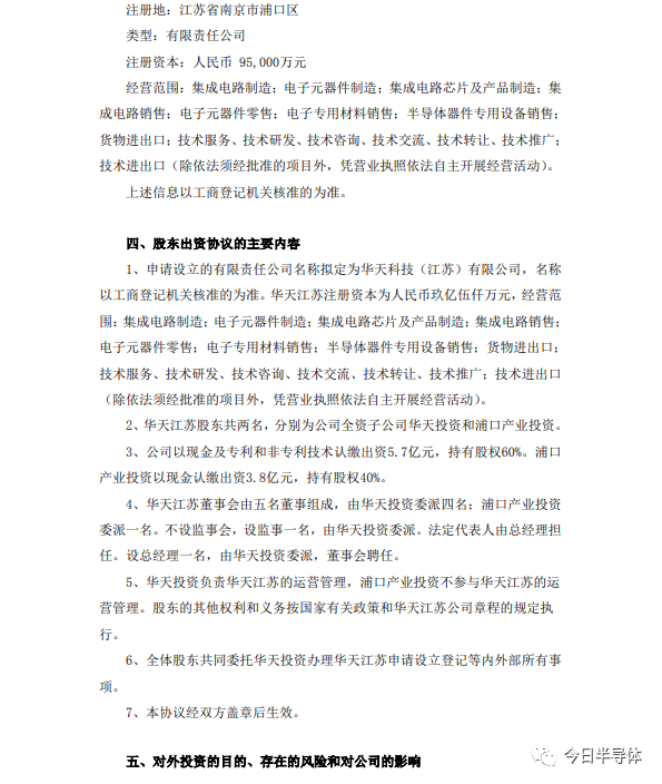 公告显示,华天江苏注册资本9.5亿元。公司以现金及专利和非专利技术认缴出资5.7 亿元,占华天江苏注册资本的60%,浦口产业投资以现金认缴出资3.8亿元,占华天江苏注册资本的40%。