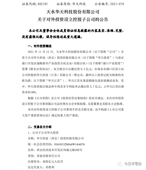 11月12日,华天科技发布公告称,全资子公司华天投资与浦口产业投资签署《股东出资协议》,双方拟合计认缴出资 9.5 亿元,在南京市浦口区设立由公司控股的华天科技(江苏)有限公司(下称:华天江苏)。