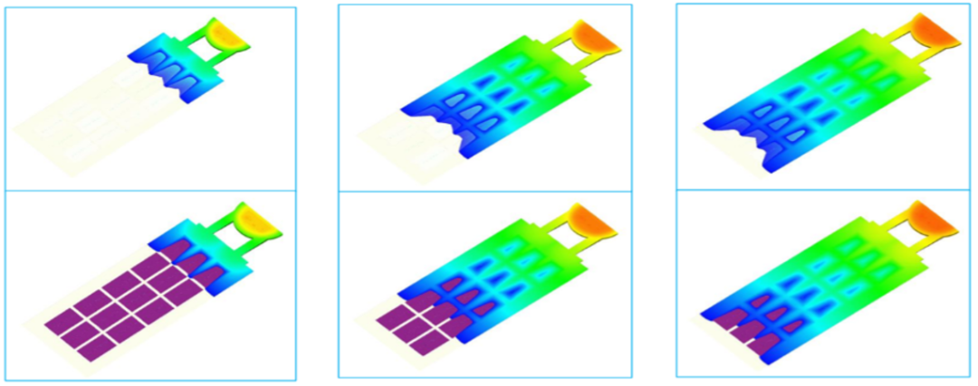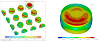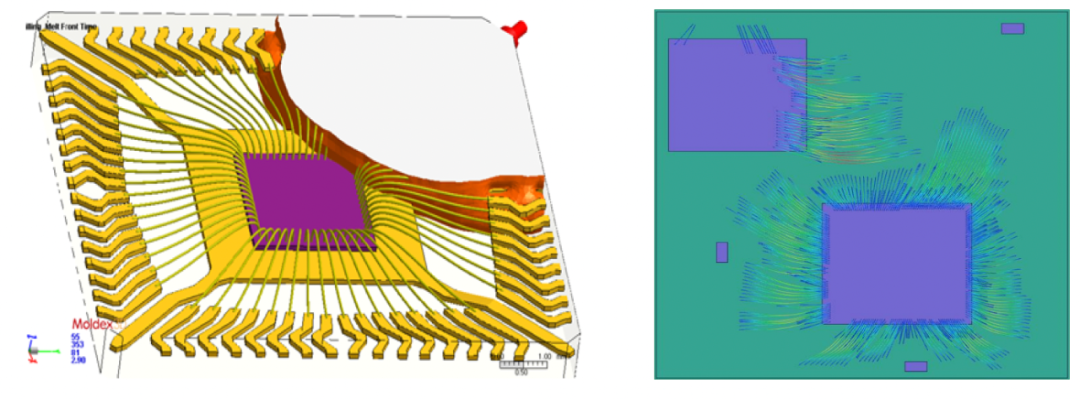 应用实体混合网格技术模拟塑封料的填充过程,进行填充分析、冲线分析、导线架偏移分析等,为治具设计、材料设计/选择、制程参数等提供建议。