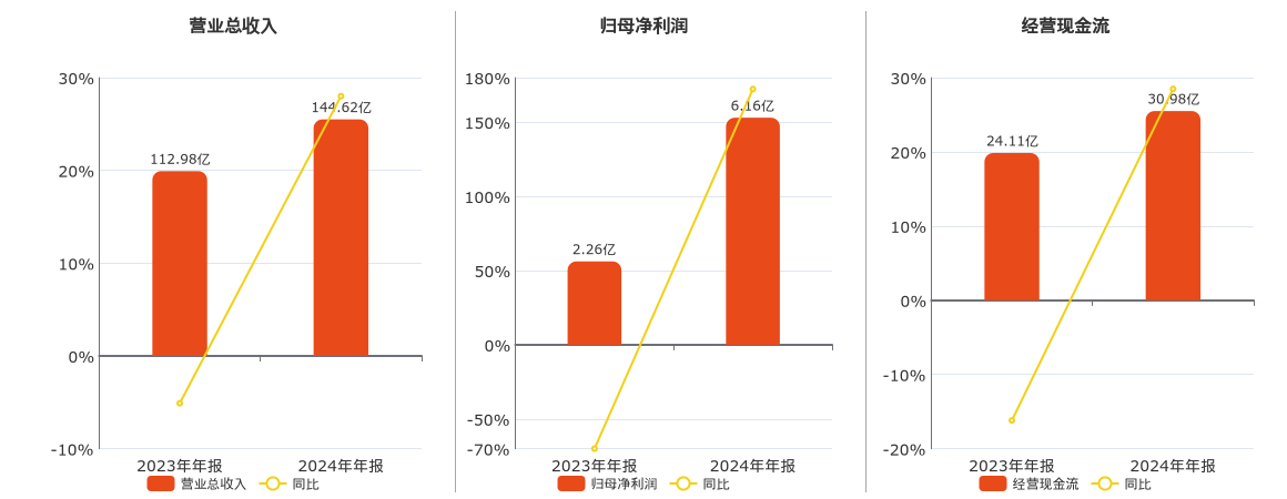 公司营业总收入为144.62亿元。归母净利润为6.16亿元。经营活动现金净流入为30.98亿元。