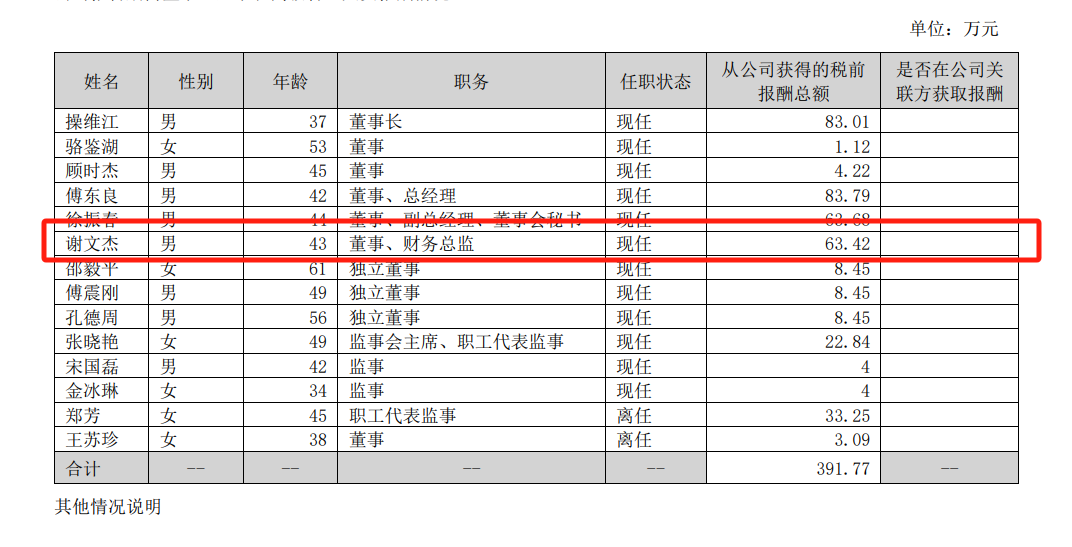 据公告披露,谢文杰2023年从公司获得的税前报酬总额为63.42万元,2022年同期为60.03万元。