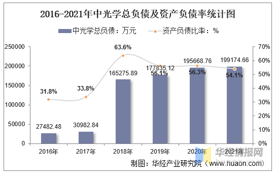 2016-2021年中光学总负债及资产负债率统计图