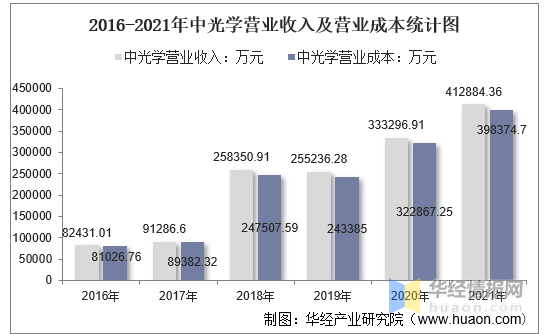2021年中光学营业收入为412884.36万元,相比2020年增长了79587.45万元,同比增长23.88%;营业成本为398374.7万元,相比2020年增长了75507.45万元,同比增长23.39%。
