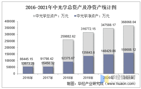 华经产业研究院数据显示:2021年中光学总资产为368068.04万元,相比2020年增长了20479.87万元,同比增长5.89%;净资产为159008.12万元,相比2020年增长了10578.26万元,同比增长7.13%。