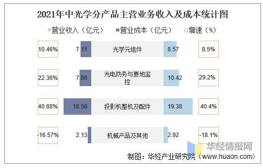 按产品分类来看,2021年中光学主营业务总收入为41.29亿元,主营业务总成本为39.84亿元,其中:光学元组件实现营业收入为8.57亿元,营业成本为7.11亿元;光电防务与要地监控实现营业收入10.42亿元,营业成本为7.86亿元;投影机整机及配件实现营业收入为19.38亿元,营业成本为18.56亿元;机械产品及其他实现营业收入为2.92亿元,营业成本为2.13亿元。