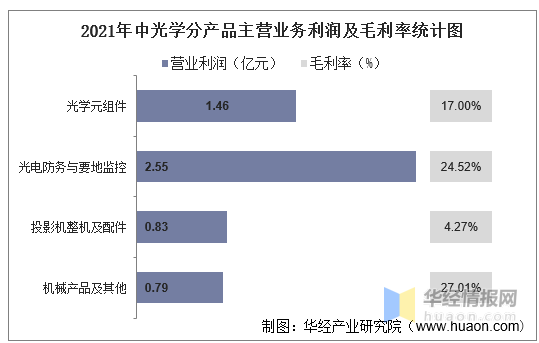 按行业分类来看,2021年中光学主营业务总利润为5.63亿元,其中:光学仪器制造实现营业利润为5.63亿元,毛利率为13.63%。