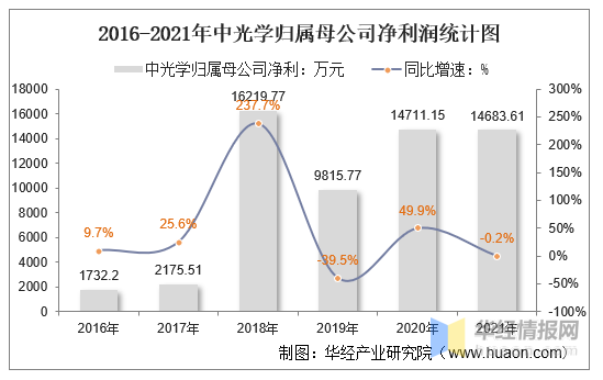 2021年中光学归属母公司净利润为14683.61万元,相比2020年减少了27.54万元,同比下降0.19%。