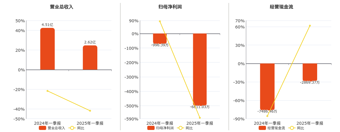 公司营业总收入为2.62亿元,较去年同报告期营业总收入减少1.89亿元,同比较去年同期下降41.91%。归母净利润为-6811.03万元,较去年同报告期归母净利润减少5814.63万元。经营活动现金净流入为-2869.37万元,较去年同报告期经营活动现金净流入增加4617.09万元。
