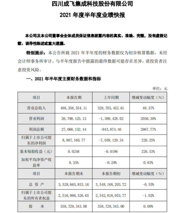 集微网消息,7月28日,成飞集成发布上半年业绩快报显示,成飞集成上半年净利润889万元,实现扭亏为盈。