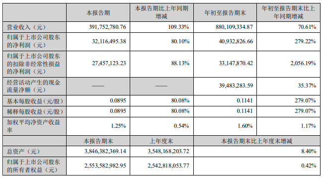 10月26日,成飞集成(SZ002190)公告,第三季度营业收入约3.92亿元,比上年同期增加109.33%,归属于上市公司股东的净利润约3211.65万元,比上年同期增加80.10%,归属于上市公司股东的扣除非经常性损益的净利润约2745.71万元,比上年同期增加88.13%,基本每股收益0.0895元/股,比上年同期增加80.08%,总资产约38.46亿元,比上年同期增加8.40%。