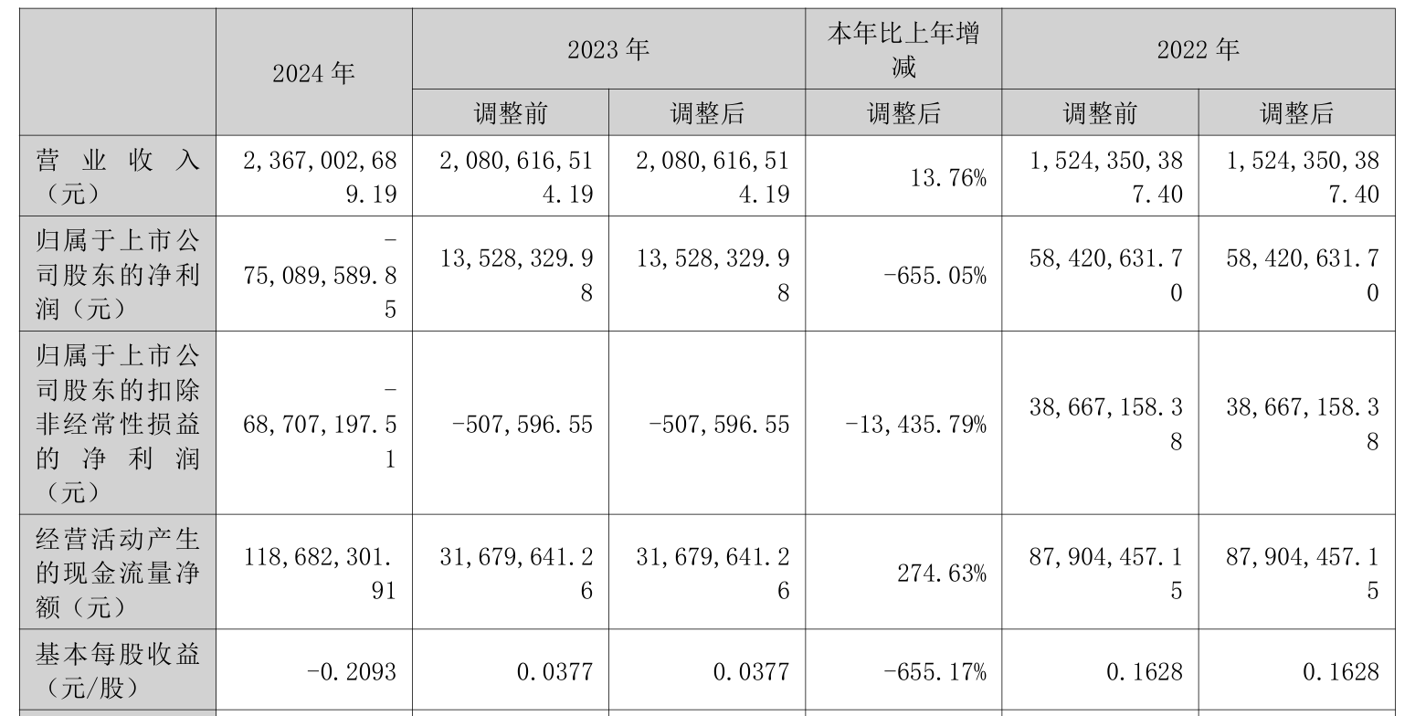 3月14日晚间,成飞集成(深市代码:002190)发布2024年年度报告。数据显示,该公司报告期内实现营收23.67亿元,同比增长13.76%;归属于上市公司股东的净利润-7508.96万元,同比盈转亏。