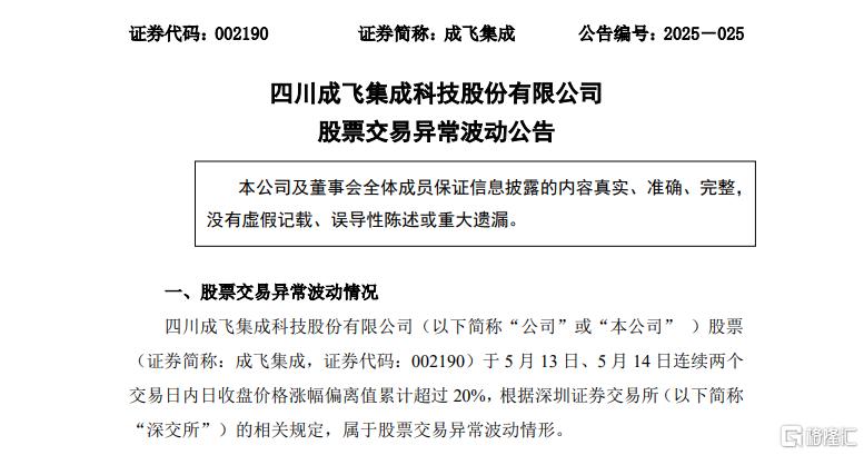 昨晚成飞集成公告表示,截至2025年5月14日,公司股票已连续6个交易日涨停,市盈率倍数已高达-141.71。