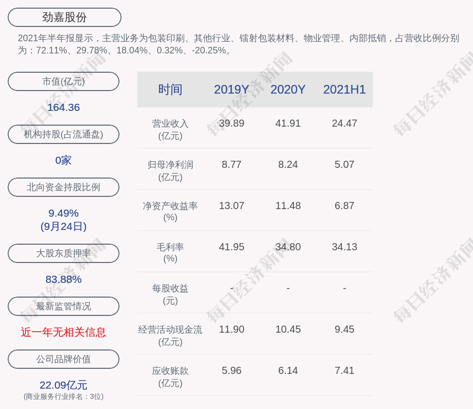 2021年半年报显示,劲嘉股份的主营业务为包装印刷、其他行业、镭射包装材料、物业管理、内部抵销,占营收比例分别为:72.11%、29.78%、18.04%、0.32%、-20.25%。