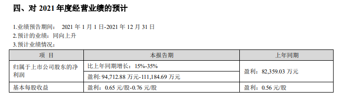 同时,劲嘉股份还发布2021年业绩预告,公司预计2021年1-12月归属上市公司股东的净利润9.47亿至11.12亿,同比增长15%至35%。