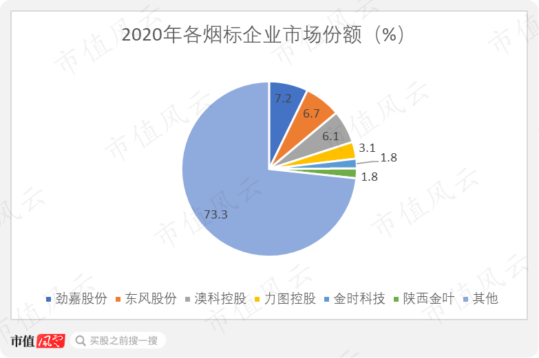Wind数据显示,2020年,前七大烟标企业占市场份额的26.7%。其中,劲嘉股份排名第一,市场份额达7.2%,东风股份次之,二者较为接近。