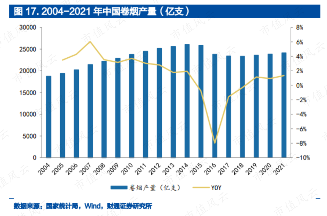 至于两家头部企业烟标收入增长停滞的原因,主要跟2016年以来下游卷烟产量稳定在24,000亿支左右,需求较为稳定有关。