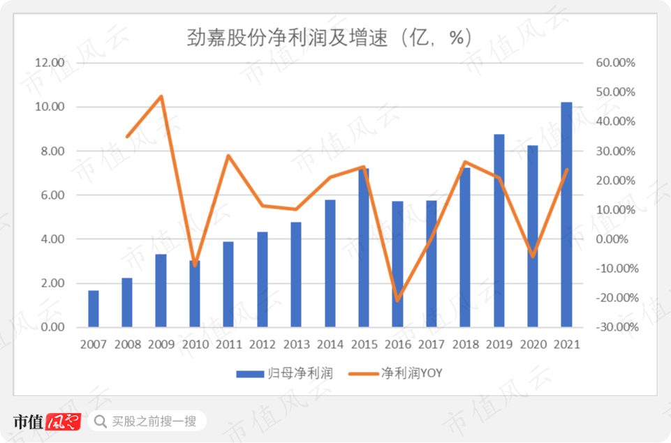 同时,劲嘉股份2021年实现归母净利润10.2亿,同比增长23.79%。自2007年登陆中小板以来,上市15年的劲嘉股份累计净赚82.15亿,CAGR达13.85%。