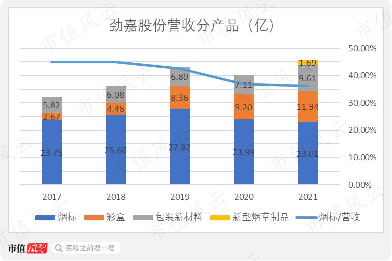 2021年,烟标的营收继续下滑至23.01亿,营收占比也由2017年的80.64%下降至45.41%。