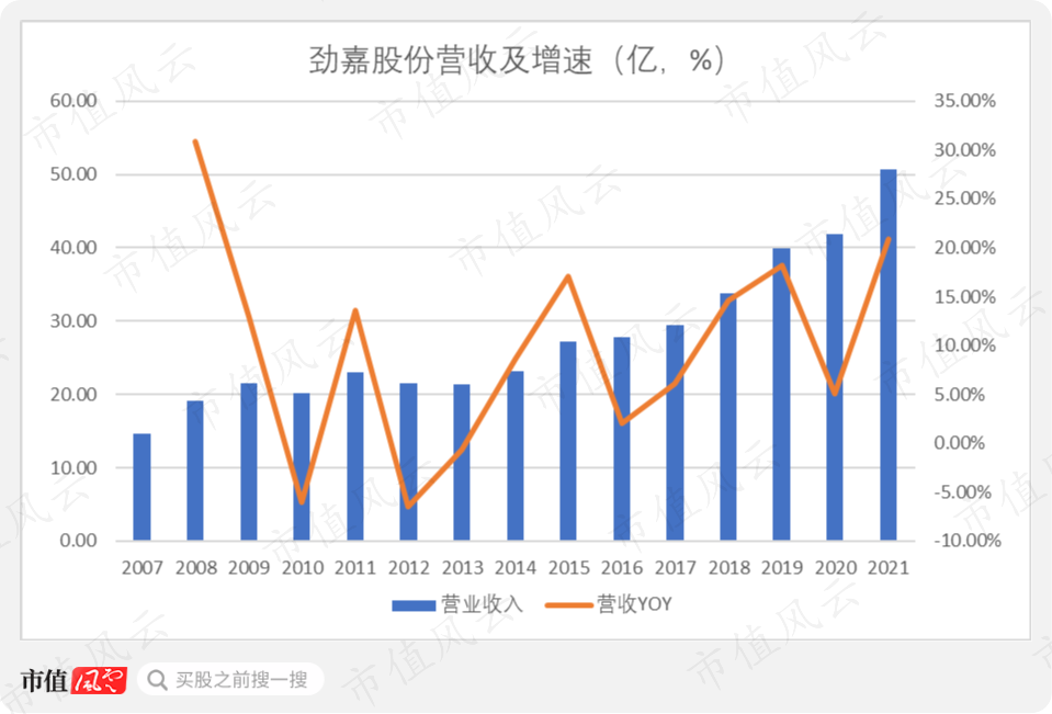 2017年之前,公司营收规模徘徊在30亿以下,2018年以来,劲嘉股份似乎突破了增长瓶颈,2021年营收规模首次突破50亿。