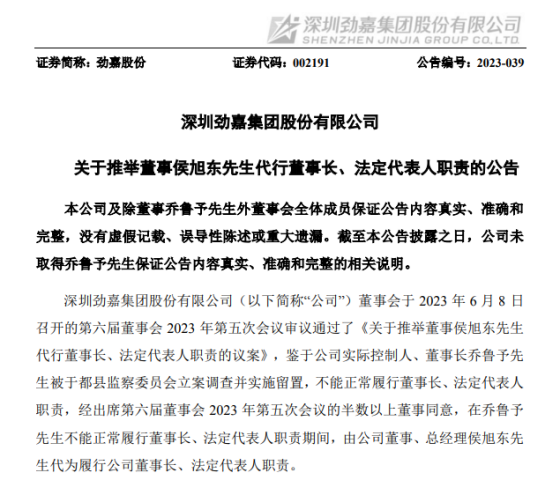 中国网财经6月9日讯(记者张增艳)劲嘉股份昨日晚间公告称,由于公司实际控制人、董事长乔鲁予被立案调查并实施留置,不能正常履行董事长、法定代表人职责,董事会决定由公司董事、总经理侯旭东代为履行公司董事长、法定代表人职责。