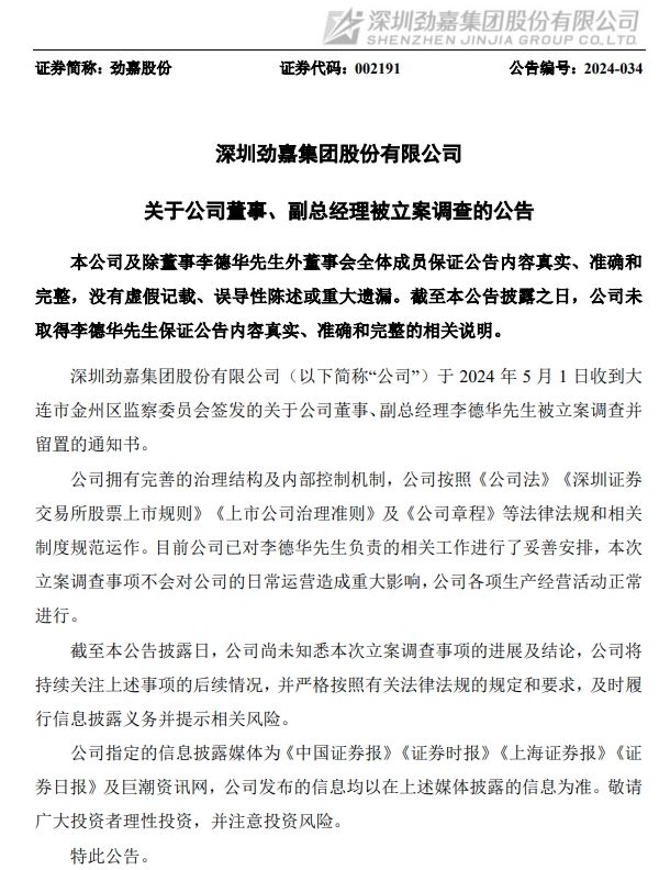 5月5日晚间,劲嘉股份(002191)公告,公司于5月1日收到大连市金州区监察委员会签发的关于公司董事、副总经理李德华先生被立案调查并留置的通知书。