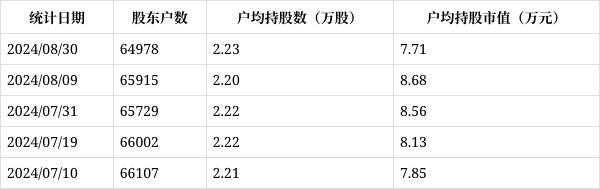 从9月6日公开信息显示,劲嘉股份截至2024年8月30日公司股东户数为6.50万户,较上期(2024年8月9日)减少634户,降幅为0.97%,变化不大。