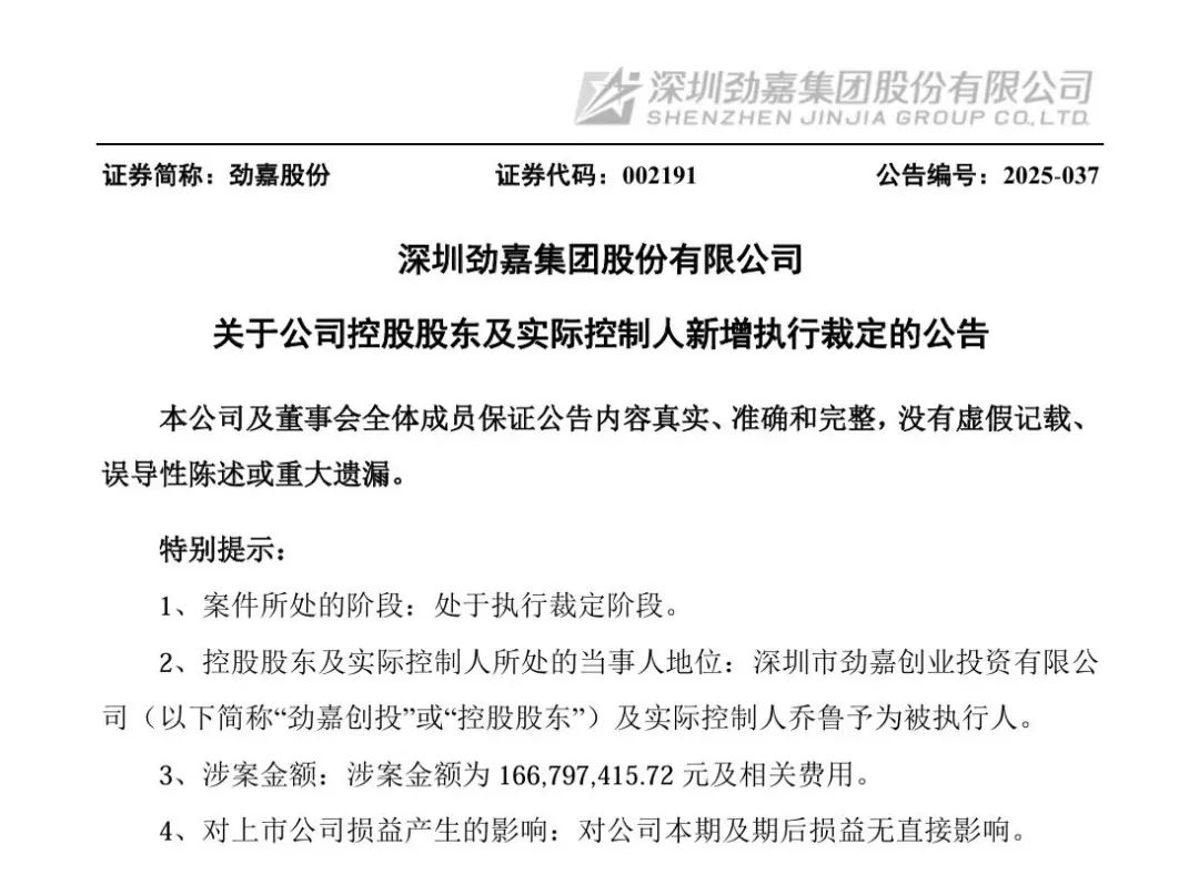 5月8日晚间,劲嘉股份(深市代码:002191)公告称,公司控股股东深圳市劲嘉创业投资有限公司(以下简称“劲嘉创投”)收到广东省深圳市南山区人民法院下发的执行裁定书。
