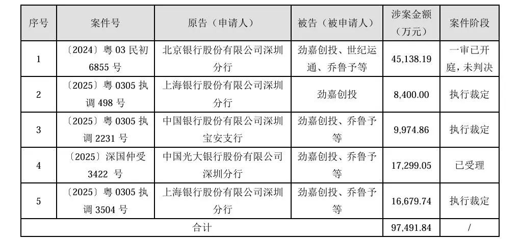 值得注意的是,最近12个月内,劲嘉创投及其一致行动人新疆世纪运通股权投资合伙企业(有限合伙)(以下简称“世纪运通”)、实控人乔鲁予涉及的重大诉讼、仲裁及司法执行事项共有5项,涉案金额高达9.75亿元。