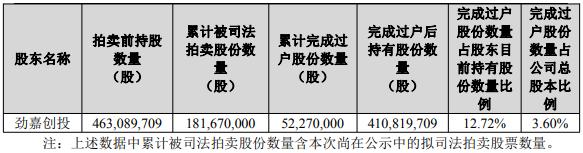 劲嘉创投累计被司法拍卖股份数量为181,670,000股,累计完成过户股份数量为52,270,000股。