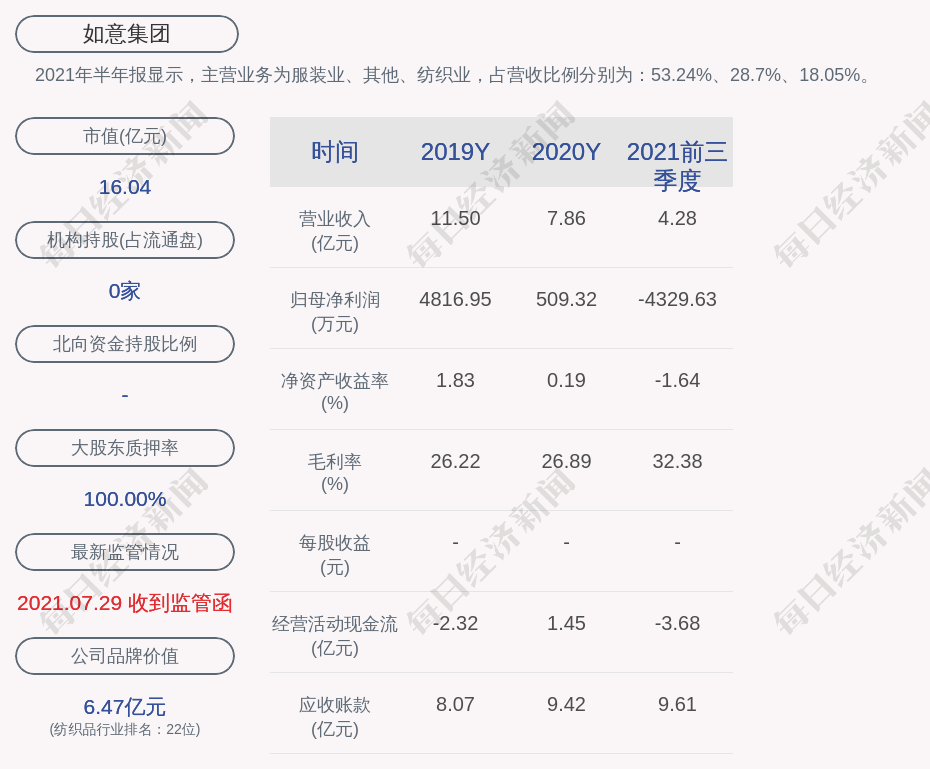 2021年半年报显示,如意集团的主营业务为服装业、其他、纺织业,占营收比例分别为:53.24%、28.7%、18.05%。