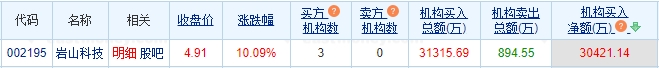 龙虎榜数据显示,今日,买入岩山科技金额最大的前五名中,有3家机构专用席位。经统计,岩山科技的机构席位今日净买入金额为30421.14万元。