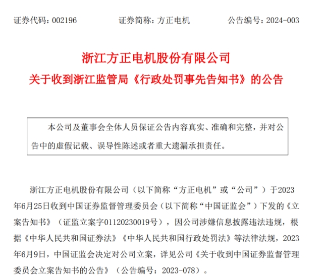 近日,方正电机发布关公告称,公司收到中国证券监督管理委员会浙江监管局(以下简称“浙江证监局”)《行政处罚事先告知书》(浙处罚字【2024】1号),经查明,方正电机存在对“三包费”的会计估计不合理、不恰当地扩大上海海能商誉相关资产组等涉嫌违法的事实。