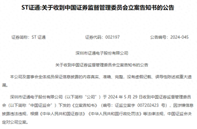 5月29日晚间,ST证通发布公告称,公司于5月29日收到证监会下发的《立案告知书》,因涉嫌信息披露违法违规,根据相关法律法规,证监会决定对公司立案。