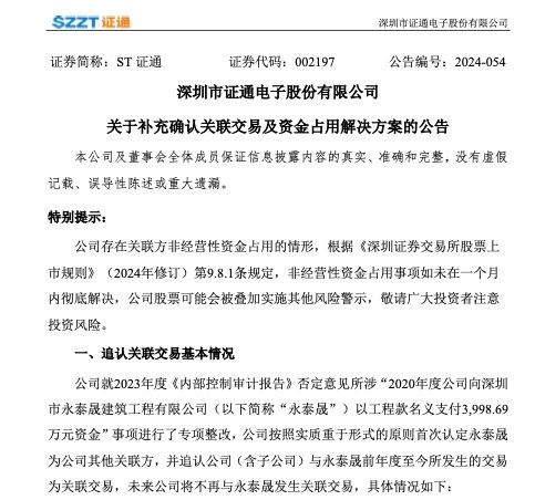 6月18日晚间,深圳市证通电子股份有限公司(以下简称“ST证通”或“公司”)发布关于补充确认关联交易及资金占用解决方案的公告。公告称,公司就2023年度《内部控制审计报告》否定意见所涉“2020年度公司向深圳市永泰晟建筑工程有限公司(以下简称“永泰晟”)以工程款名义支付3,998.69万元资金”事项进行了专项整改,公司按照实质重于形式的原则首次认定永泰晟为公司其他关联方,并追认公司(含子公司)与永泰晟前年度至今所发生的交易为关联交易,未来公司将不再与永泰晟发生关联交易。