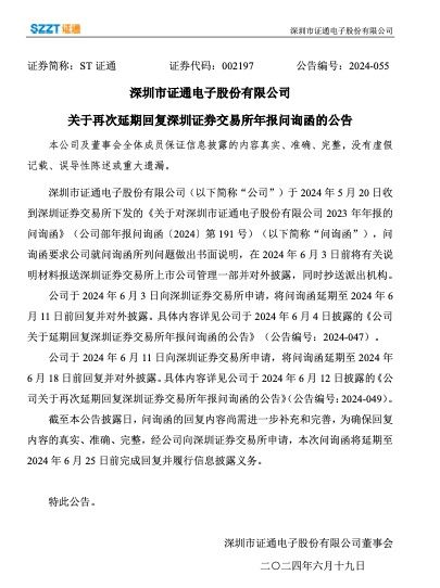 6月18日晚间,ST证通发布关于再次延期回复深圳证券交易所年报问询函的公告。公告称,问询函的回复内容尚需进一步补充和完善,为确保回复内容的真实、准确、完整,经公司向深圳证券交易所申请,本次问询函将延期至2024年6月25日前完成回复并履行信息披露义务。