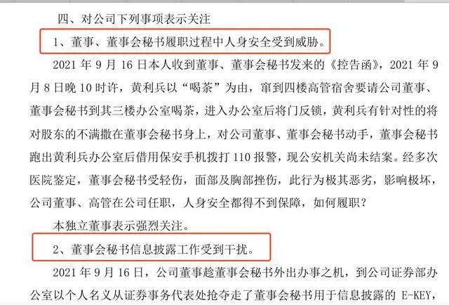 对此,嘉应制药独董肖义南对媒体陈诉,9月16日,肖义南收到公司董秘徐胜利发来的《控告函》称,2021年9月8日晚10时许,黄利兵(嘉应制药董事)以“喝茶”为由,窜到四楼高管宿舍邀请徐胜利到其三楼办公室喝茶,进入办公室后将门反锁,黄利兵将对股东的不满撒在徐胜利身上,对徐胜利动手,徐胜利跑出黄利兵办公室后借用保安手机拨打110报警,现公安机关尚未结案。经多次医院鉴定,徐胜利受轻伤,面部及胸部挫伤。