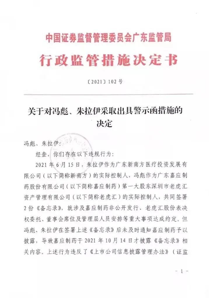 10月16日,嘉应制药披露了监管警示函,因未及时履行披露信息披露义务,包括嘉应制药,嘉应制药董事长朱拉伊,嘉应制药董秘徐胜利,老虎汇实控人冯彪在内的四方,均被广东证监局采取出具警示函。