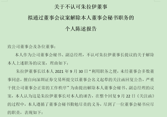 不料,反转来得更快。10月18日晚,被宣布解聘的徐胜利,向媒体提交了一份《个人陈述报告》,明确表示他本人不认可公司董事会解除其董事会秘书职务的议案,并称嘉应制药董事长朱拉伊“诬告”。