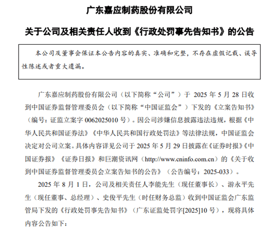 8月4日,嘉应制药发布公告称,公司及相关责任人员于8月1日收到中国证监会广东监管局下发的《行政处罚事先告知书》。