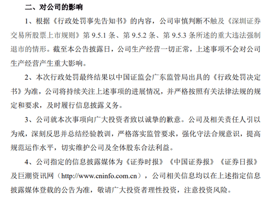 嘉应制药被处罚后,发布公告表示,此次处罚不触及重大违法强制退市情形,公司生产经营一切正常,将深刻反思并强化合规管理,向投资者致歉。公司强调,后续将严格履行信息披露义务,确保类似事件不再发生。