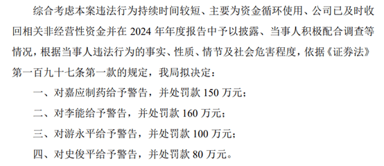 广东证监局拟对嘉应制药及相关责任人作出总计490万元的罚款决定,其中对公司罚款150万元,对董事长李能罚款160万元,对总经理游永平罚款100万元,对时任财务总监史俊平罚款80万元。