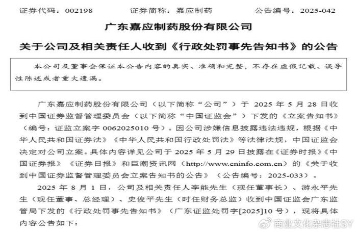 一场看似普通的行政处罚,撕开了资本市场最隐秘的暗疮。8月4日,广东嘉应制药(002198)因未披露2.19亿元关联交易,董事长李能、总经理游永平等高管被合计罚款近500万元。这场“监守自盗”式的资金腾挪,暴露出这家老牌药企在资本漩涡中迷失的深层困局——当管理层将上市公司视为提款机,当借壳方把资本市场当作赌局,一场关于治理、合规与产业价值的深刻反思正在上演。