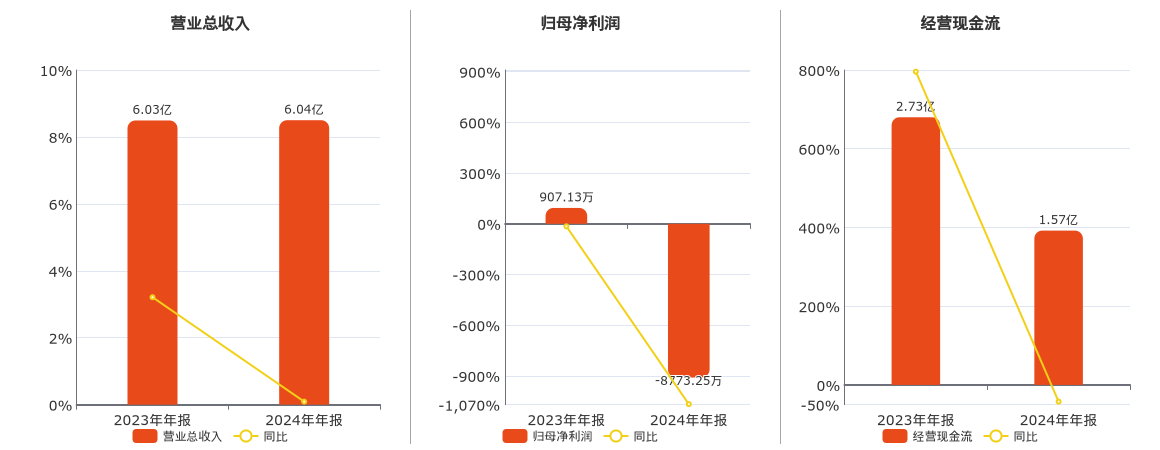 公司营业总收入为6.04亿元,较去年同报告期营业总收入增加55.70万元,实现4年连续上涨,同比较去年同期上涨0.09%。归母净利润为-8773.25万元,较去年同报告期归母净利润减少9680.38万元,同比较去年同期下降1067.15%。经营活动现金净流入为1.57亿元,较去年同报告期经营活动现金净流入减少1.15亿元,同比较去年同期下降42.34%。