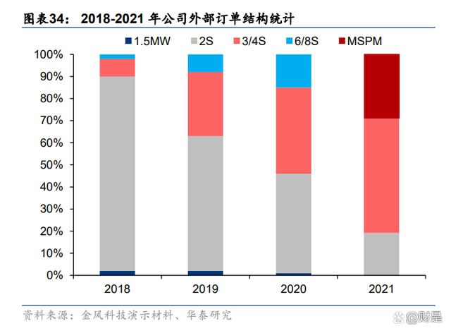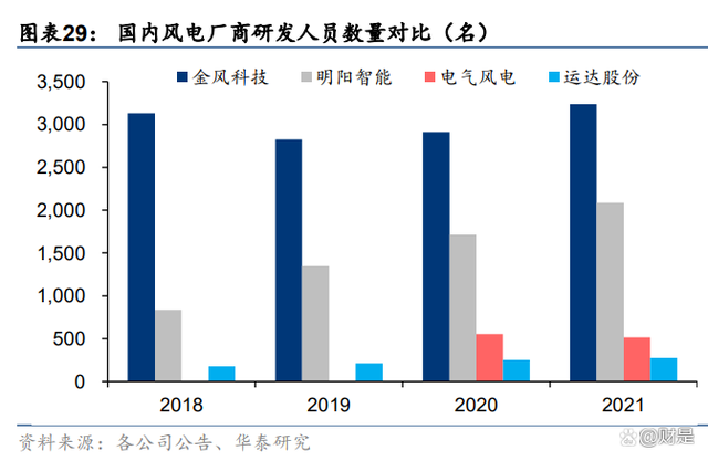 公司持续保持高研发投入。以上市风电整机厂商 2018-2021 年披露年报数据为例,金风科技研发人员保持在 3000 名水平,研发费用由 10.62 亿元增长至 15.84 亿元,显著高于行业其他风电整机厂商。其旗下机型覆盖集中式、大基地、分散式、常规海拔、高海拔以及海上等多种应用场景,也是国内少数持续研发直驱式风电机组并同时具备直驱和半直驱机组出货能力的厂商之一。